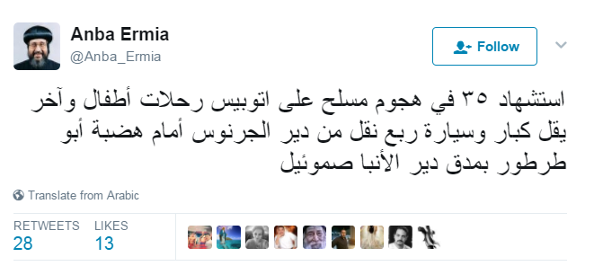 وكتب الأنبا أرميا، عبر حسابه بموقع التدوينات الصغيرة “تويتر”: “استشهاد 35 في هجوم مسلح على أتوبيس رحلات أطفال وآخر يقل كبار وسيارة ربع نقل من دير الجرنوس أمام هضبة أبو طرطور بمدق دير الأنبا صموئيل”.