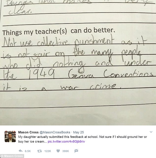 واعترضت الطفلة آفا على عقاب المعلم لتلاميذ الفصل كله بسبب خطأ طالب واحد، معتبرة أن ما فعله “جريمة حرب، ويخالف بنود اتفاقية جنيف، بمقتضى نص أن الاعتداء على جماعة من البشر لم يرتكبوا ذنبًا يعتبر جريمة حرب يعاقب عليها القانون”.