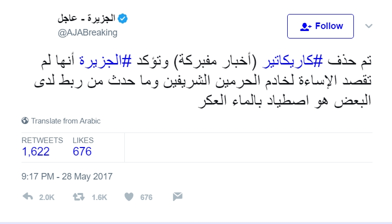 أعلنت شبكة الجزيرة، عبر حسابها على موقع تويتر، حذف كاريكاتير "أخبار مفبركة"، والذي اثار الجدل على مواقع التواصل الاجتماعي، مؤكدة أنها لم تقصد الإساءة إلى خادم الحرمين الشريفين.