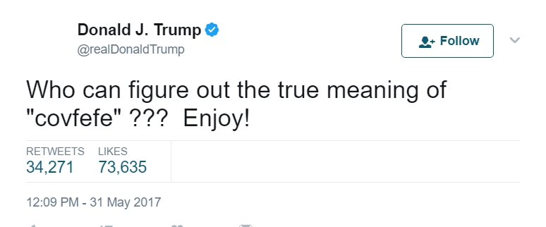 وأثار الرئيس الأميركي الجدل بعد كتابته تغريدة عبر حسابه، ذكر فيها كلمة “#Covfefe”، والتي حاول النشطاء معرفة معناها في كل اللغات إلا أنهم فشلوا في ذلك قبل أن يحذف التغريدة من حسابه ليستبدلها بأخرى، يمازح فيها ردود الفعل على الكلمة.