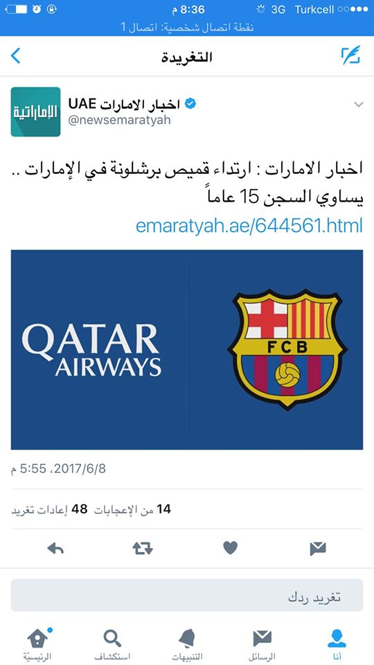 نشر حساب “أخبار الإمارات” الموثق عبر موقع التواصل الإجتماعي “تويتر” خبر عقوبة السجن لمن يرتدي قميص نادي برشلونة الإسباني، الذي يحمل اسم الخطوط القطرية “Qatar Airways” الناقل الرسمي للفريق.