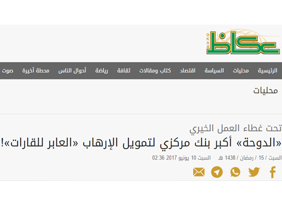 ونشرت عكاظ تقريرا عبر موقعها، اعتبرت فيه أن قطر أكبر بنك مركزي لتمويل الإرهاب “العابر للقارات”، مشيرة إلى استغلالها المنظمات الخيرية من أجل تمويل الإرهاب كغطاء.