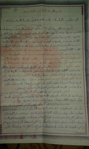 كيف حالك يا أمي ؟… أكيد إن شاء الله بخير ومش لسه قاعدين نعيط بقه والكلام اللي مش هيغير شئ ده …قضاء الله لن يغيره أحد وأجلي في كتاب عنده يوم ولدتني فسألقاه في الوقت الذي حدده وهيهات لبشر أن يغيره …فمن أحب لقاء الله. أحب الله لقاءه.. وإني والله أحب لقاء الله وأساله أن يكون هذا اللقاء في رضاه.. قل هل تربصون بنا إلا إحدي الحسنيين ونحن نتربص بكم أن يصيبكم الله بعذاب من عنده او بايدينا فتربصوا انا معكم متربصون ..