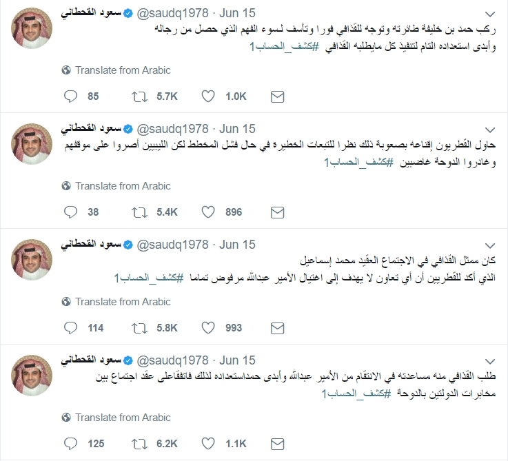 ونشر القحطاني عدد من التغريدات، زعم فيها أن قطر شاركت مع المخابرات الليبية، في التخطيط لاغتيال الملك عبدالله بن عبدالعزيز، عام 2003.