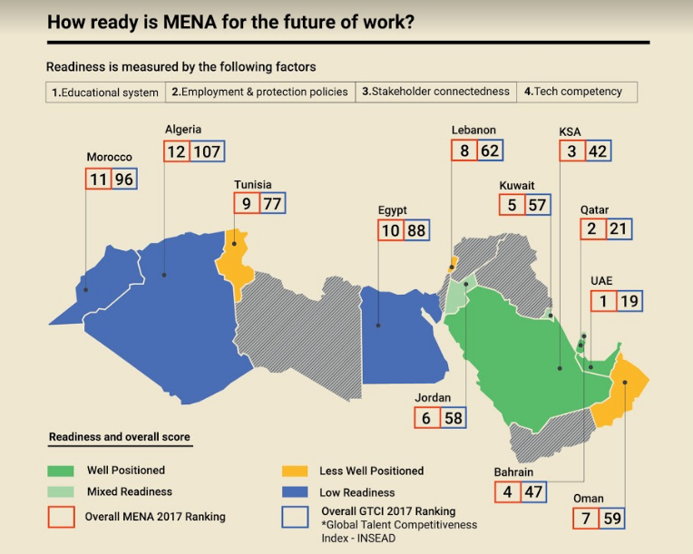 كما تُظهر الألوان المختلفة درجة استعداد الدولة لمستقبل الوظائف، فنجد أنّ الدول الأكثر استعداداً تضم السعودية والإمارات والبحرين، وتليها الكويت والأردن، أمّا عمان ولبنان وتونس فهي أقل استعداداً أما الأدنى على الإطلاق فهي مصر، والمغرب والجزائر.