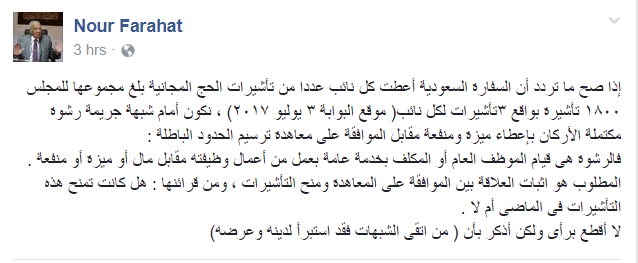 و كتب «فرحات»، في منشور على حسابه في«فيسبوك»، اليوم الثلاثاء،« إذا صح ما تردد أن السفارة السعودية، أعطت كل نائب عددًا من تأشيرات الحج المجانية، بلغ مجموعها للمجلس ١٨٠٠ تأشيرة بواقع ٣ تأشيرات لكل نائب (موقع البوابة ٣ يوليو ٢٠١٧)، نكون أمام شبهة جريمة رشوة مكتملة الأركان بإعطاء ميزة ومنفعة مقابل الموافقة على معاهدة ترسيم الحدود الباطلة».