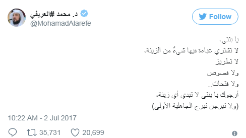 وقال العريفي: «يا بنتي، لا تشتري عباءة فيها شيء من الزينة، لا تطريز، ولا فصوص، ولا فتحات».