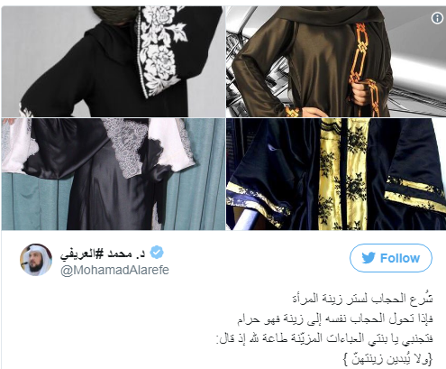 وفي تغريدة أخرى، نشر العريفي صور عباءات نسائية تصنف بأنها «غير شرعية»، وعلّق عليها: «شُرع الحجاب لستر زينة المرأة؛ فإذا تحوّل الحجاب نفسه إلى زينة فهو حرام».