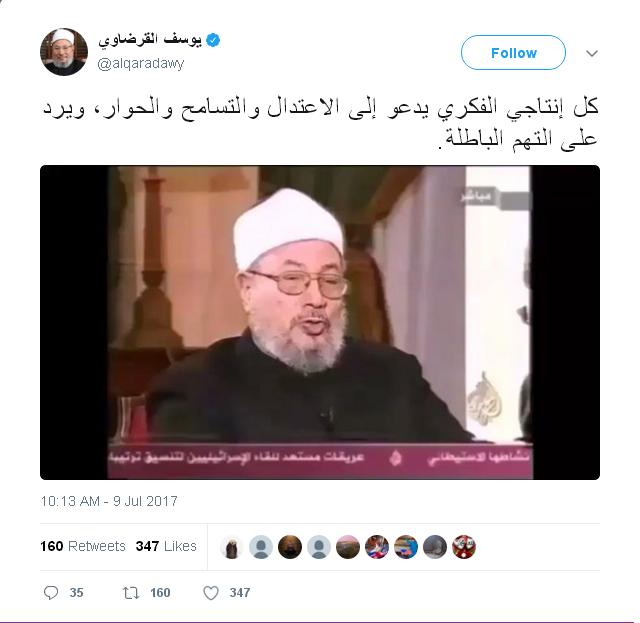 جاء تصريح القرضاوي في تغريدة عبر حسابه على موقع «تويتر» اليوم الأحد، مرفقًا مقطع فيديو لجزء من مقابلة أرشيفية معه على قناة «الجزيرة»؛ فيما يبدو ردًا على سؤال عن اتهامه بالدعوة إلى التطرف.
