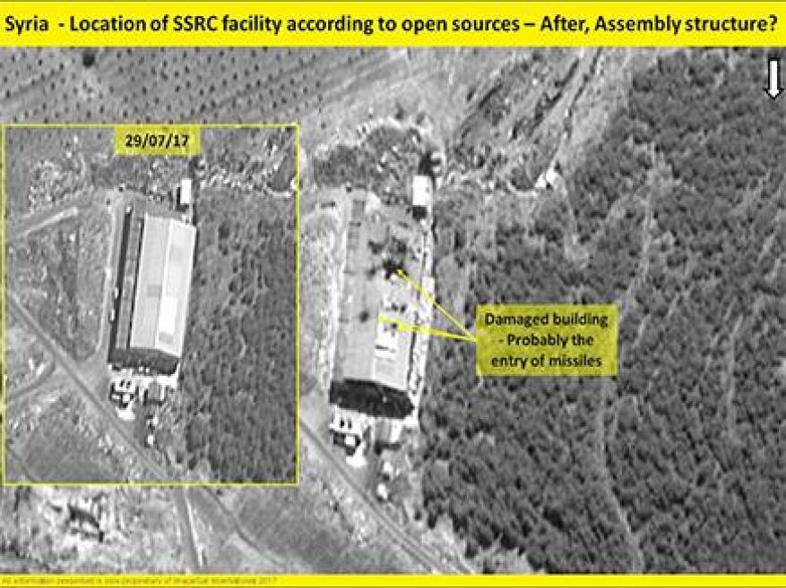 وقالت الصحيفة، بحسب وكالة شهاب، إن الصور تؤكد تضرر حوالي خمسة مباني رئيسية من الهجمة، أبرزها مركز الدراسات والبحوث العلمية في مدينة مصياف في منطقة حماة.