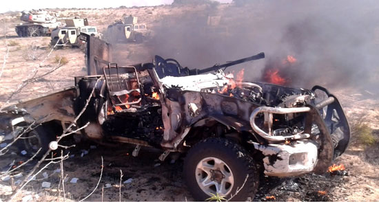 وقالت الفضائية ان القوات الجوية المصرية دمرت سيارتين يستقلهما 15 مسلحا، موضحة أن «طائرتان من دون طيار لاحقتا سيارات المسلحين المتورطين في الهجوم ودمرتهما».