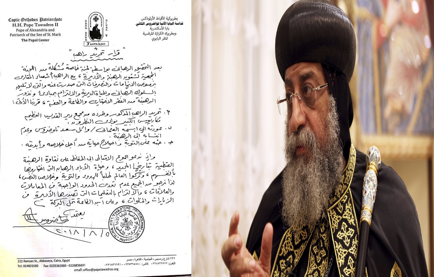 وقررت اللجنة:”تجريد الراهب المذكور وطرده من مجمع دير القديس العظيم مكاريوس الكبير بوادي النطرون وعودته إلى اسمه وائل سعد تواضروس وعدم انتسابه للرهبنة وحثه على التوبة”.