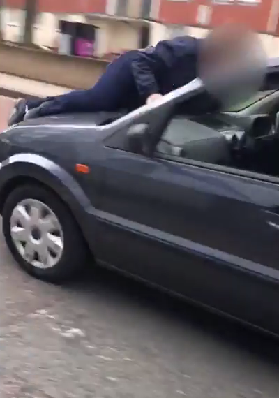 ويظهر المقطع  رجلان يبلغان من العمر 20 عامًا وهما يحملان آلات حادة، أثناء محاولتهما القفز داخل سيارة متحركة أثناء محاولته للهرب من مطاردة أهالي الحي لهم.