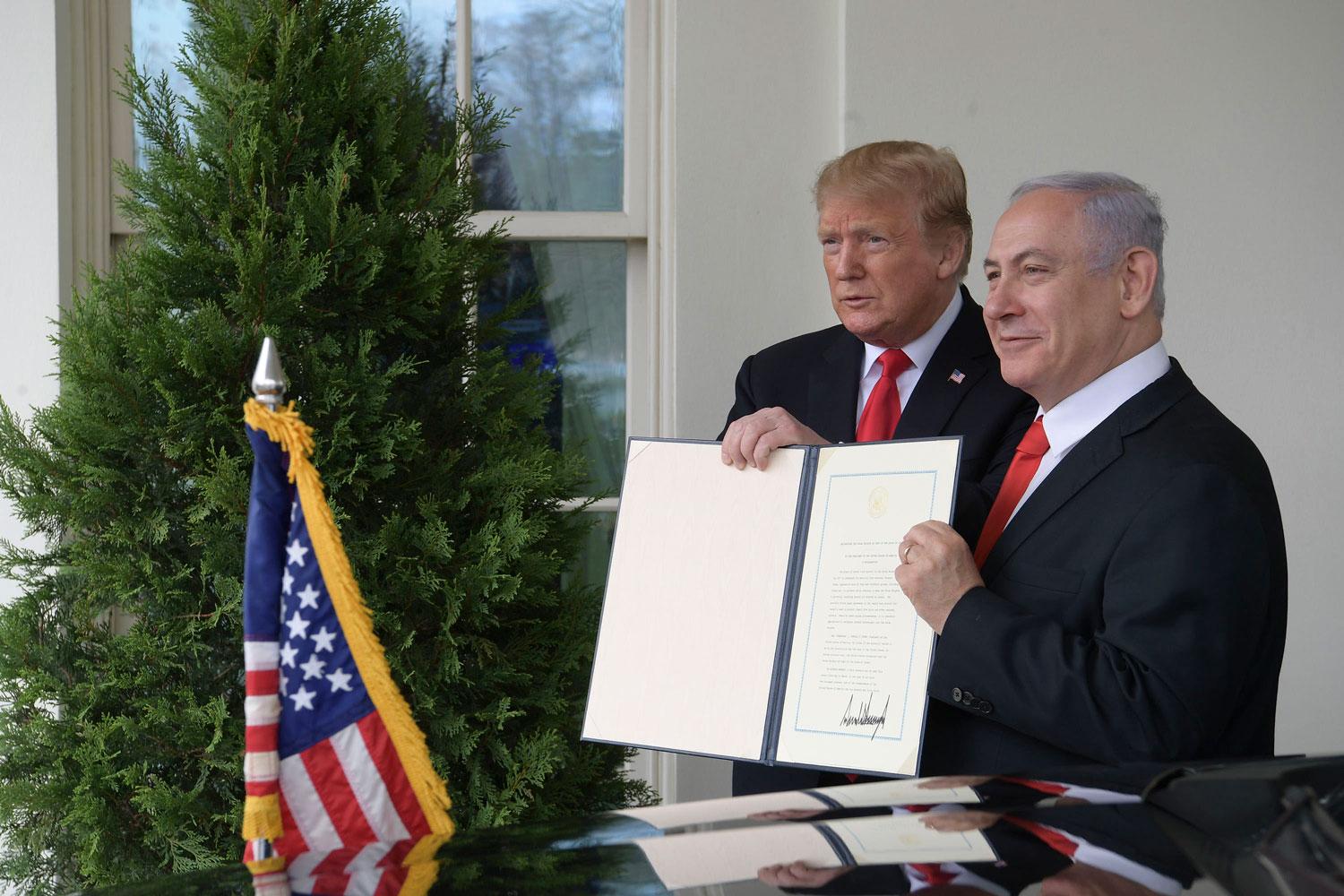 والإثنين الماضي وقع ترامب، رسميا في البيت الأبيض، وبحضور رئيس وزراء الاحتلال الإسرائيلي، بنيامين نتنياهو، مرسوما رئاسيا اعترف بموجبه بـ«سيادة» الاحتلال الإسرائيلي على الجولان المحتلة.