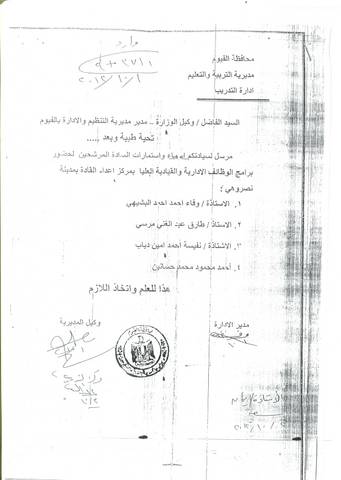 وأكد أنه "استمرارا  لمسلسل الفساد بالتربية والتعليم بمعاونة جهات إدارية قامت مديرية التربية والتعليم بإرسال أسماء كل من وفاء البشيهى، وطارق عبد الغنى مرسى ، ونفيسة أحمد أمين، وأحمد محمود محمد حسن،  لمديرية التنظيم والإدارة لحضور برامج الوظائف الإدارية ، والقيادات العليا بمركز إعداد القادة بمدينة نصر بالمخالفة للقانون , وتأكيدا لذلك تم إلغاء ندب هذه الأسماء لحضور برامج الوظائف الإدارية والقيادات العليا من قبل التنظيم والإدارة".