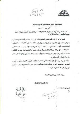 وذكر البيان أن مدير مرحلة التعليم الإعدادي والثانوي بإدارة غرب الفيوم التعليمية  راوية حافظ كامل تقدمت  بشكوى لمحافظ الفيوم،  وتم إرسالها للتفتيش المالي والإداري عن طريق محافظ الفيوم برقم 42+ 5 بتاريخ 17/7 /2012 تتهم فيها وفاء البشيهى ، مدير إدارة غرب التعليمية،  والتي وصفتها بالمحمية بزوجها محمود مصطفى ،  مدير مكتب محافظ الفيوم  ،  بمنعها من التوقيع بدفتر الحضور والانصراف،  وأنها تريد نقلها تعسفا إلى قسم التعليم الخاص رغم أقدميتها ، وتمكين مكانها لمن لا يستحقه من أنصارها ومؤيديها وهو محمد يوسف حسين.