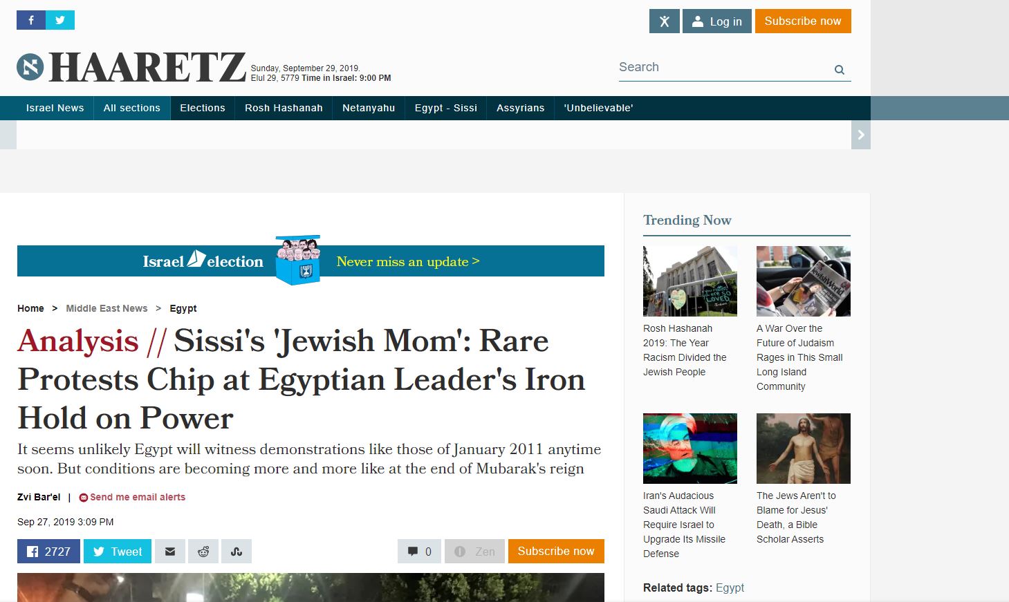 صحيفة هآرتس العبرية نشرت تقريرا عنوانه «السيسي وأمه اليهودية يواجه احتجاجات نادر» تطرقت فيه المظاهرات التي وقعت في مصر مؤكدة أنها اثارت تخوفات حول استقرار نظامه، وتطرقت للأقاويل التي تتحدذ عن ديانة أم السيسي والتي يتداول خصومه أنها من اصول عبرية مغربية قبل هجرتها لمصر وزواجها من والده.