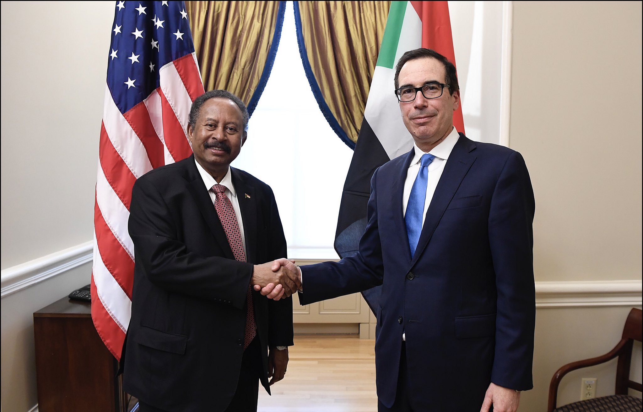 وفي شأن آخر، أكد المسؤول الأميركي لحمدوك حرص ترامب، على إيجاد صيغة توافق تخدم مصالح كل من مصر والسودان وإثيوبيا بشأن سد النهضة الذي تبنيه الأخيرة على النيل.