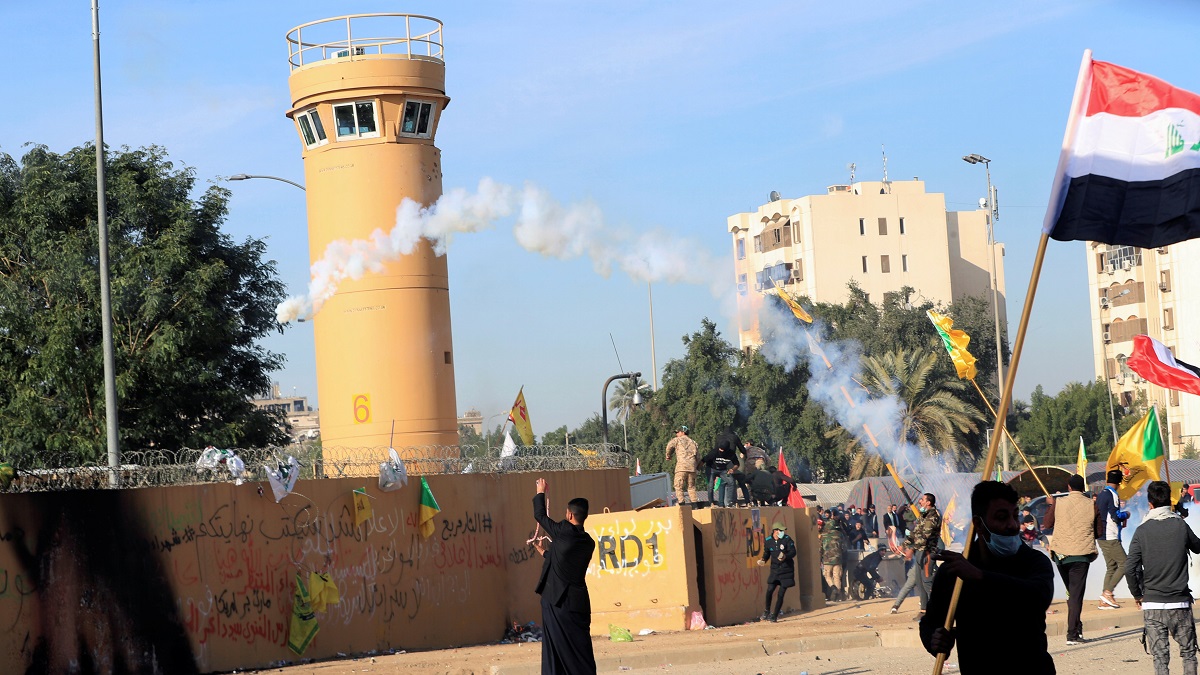 والثلاثاء، اقتحم عشرات المحتجين الغاضبين، حرم سفارة واشنطن ببغداد، وأضرموا النيران في بوابتين وأبراج المراقبة والكرفانات التي تستقبل المراجعين، قبل أن تتمكن قوات مكافحة الشغب من إبعادهم من الحرم إلى محيط السفارة.