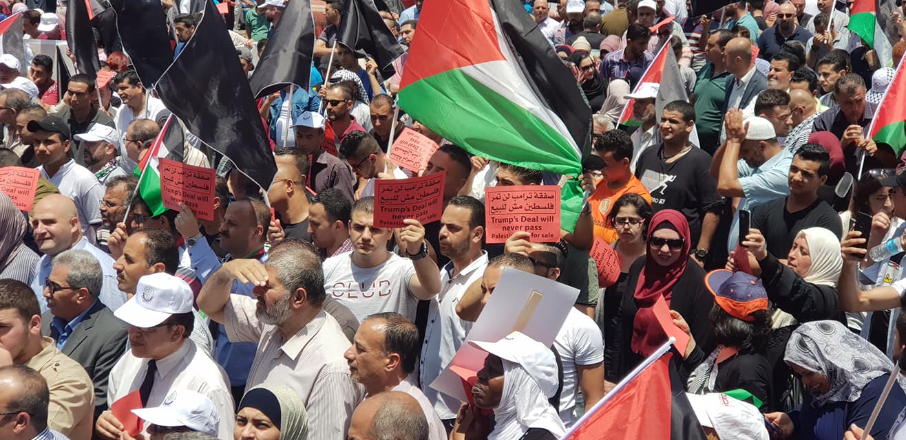 وحمل المشاركون في المسيرات بالعاصمة الأردنية عمان، ومناطق متفرقة من قطاع غزة والضفة الغربية، الأعلام الفلسطينية، ورددوا هتافات تعبر عن رفضهم لخطة «صفقة القرن» المزعومة.