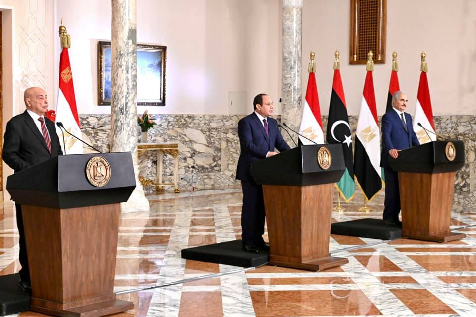 وفي مؤتمر صحفي عقده في القاهرة مع رئيس مجلس نواب طبرق شرقي ليبيا عقيلة صالح، وحفتر، قال السيسي إنه اتفق مع الاثنين على طرح «مبادرة سياسية» لإنهاء الصراع في ليبيا.