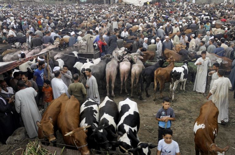توافد آلاف المصريين على سوق المواشي في القاهرة، متجاهلين تعليمات وزارة الصحة بوضع الكمامات والتباعد الاجتماعي، رغم انتشار فيروس كورونا. لشراء الأضاحي قبل العيد.