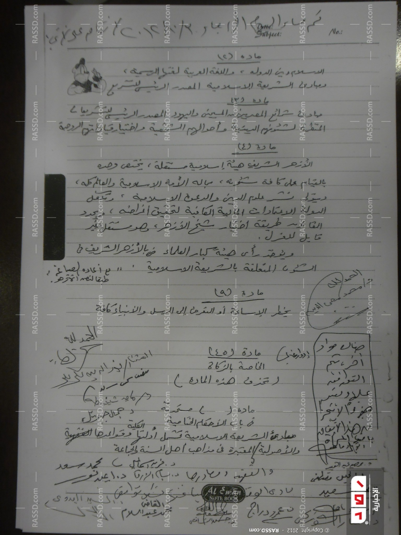 حصلت شبكة "رصد" الإخبارية علي صورة من محاضر الجلسات التي عقدت بين التيار المدني والقوي الإسلامية بالجمعية التأسيسية والتي وقع عليها المنسحبون.