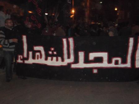 ورفع المتظاهرين خلال المسيرة التي بدأت من مديرية الأمن وحتى ميدان بالاس وسط مدينة المنيا، لافتات تندد بأحداث محمد محمود والشباب مرددين العديد من الهتافات : " الداخلية بلطجية"، "علي وعلي الصوت.. اللي هيهتف مش هيموت"