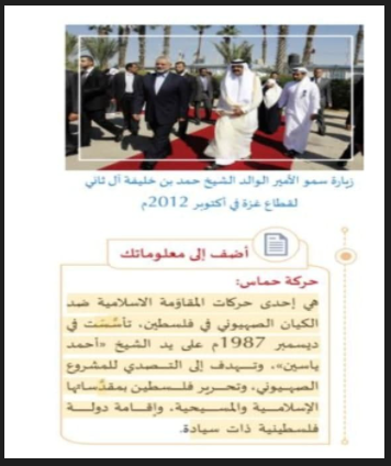 وأضاف أن «أحد الكتب المدرسية أفردت فصلاً جديداً طُلب فيه من الطلاب التعبير عن بعض الأفكار للدفاع عن فلسطين والقدس والمسجد الأقصى بالوسائل التالية: اعتراض خطوات إسرائيل لتهويد الأرض والأماكن المقدسة، وفرض إجراءات قانونية ضد القيادات الإسرائيلية، والتعبير عن موقف معارض من التطبيع».