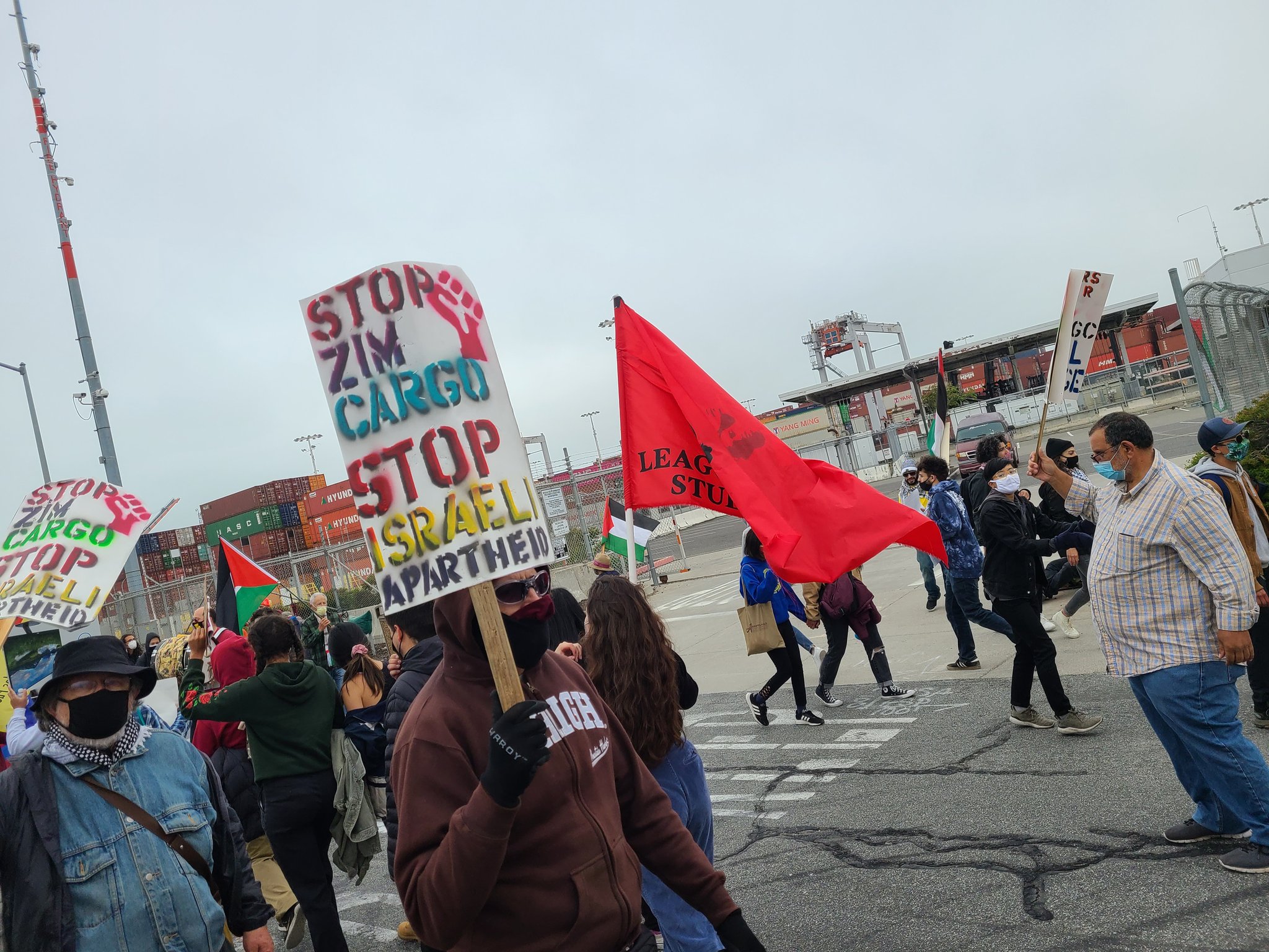 تجمع مئات المتظاهرين في ميناء أوكلاند بولاية كاليفورنيا الأمريكية لمنع سفينة شحن إسرائيلية من التفريغ.