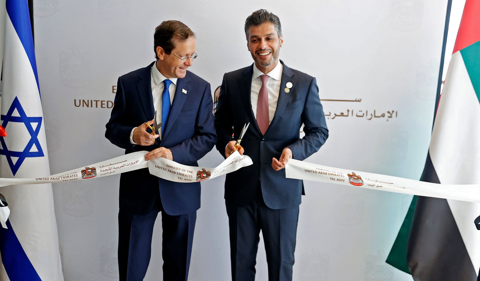 افتتحت الإمارات، الأربعاء، سفارتها في دولة الاحتلال، بحضور رئيس الإسرائيلي يتسحاق هرتسوغ، وقص سفير الإمارات لدى الاحتلال محمد آل خاجة شريط الافتتاح خلال مراسم تدشين السفارة.
