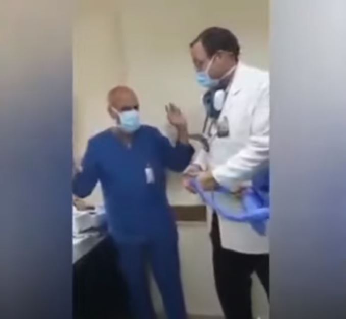 المقطع الذي تبلغ مدته 4 دقائق يظهر خلاله طبيب وشخصان يرتديان زي أمن إداري يمسك كل منهما بطرف حبل يقفز من فوقه الممرض المسن.