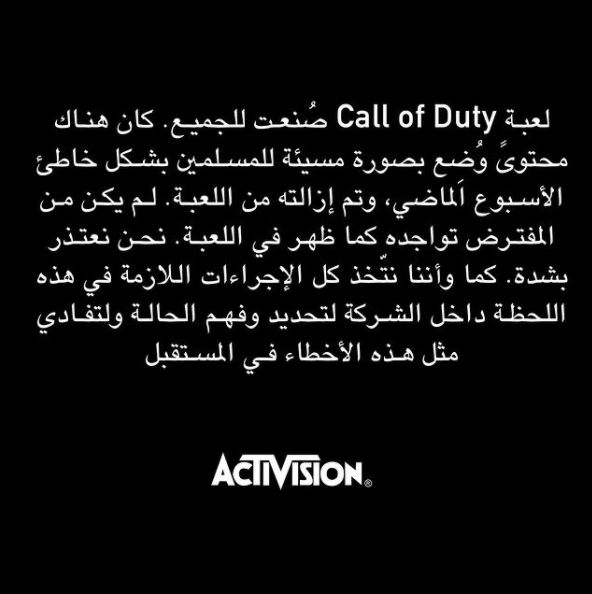 اعتذرت شركة Activision للمسلمين عبر حسابها الرسمي على مشاهد إهانة القرآن الكريم في لعبة call of duty مؤكدة فتحها تحقيقا في الواقعة.