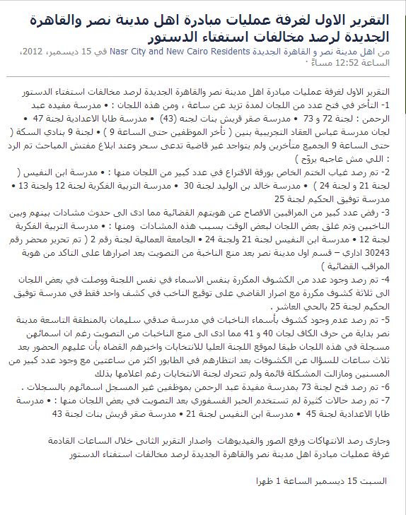 أصدرت غرفة عمليات مدينة نصر ومصر الجديدة تقريرها الأول الذي ترصد فيها أبرز الانتهاكات التي شهدتها عملية التصويت على مشروع الدستور الجديد اليوم(السبت).