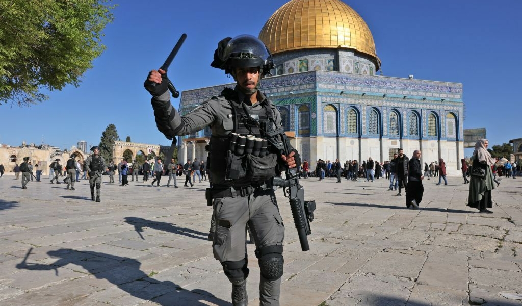 TOPSHOT - A member of the Israeli security forces lifts his batton in front of the Dome of the Rock mosque during clashes at Jerusalem's Al-Aqsa mosque compound, on April 15, 2022. - Witnesses said that Palestinian protestors threw stones at Israeli security forces, who fired rubber bullets at some of the demonstrators. (Photo by AHMAD GHARABLI / AFP) (Photo by AHMAD GHARABLI/AFP via Getty Images)