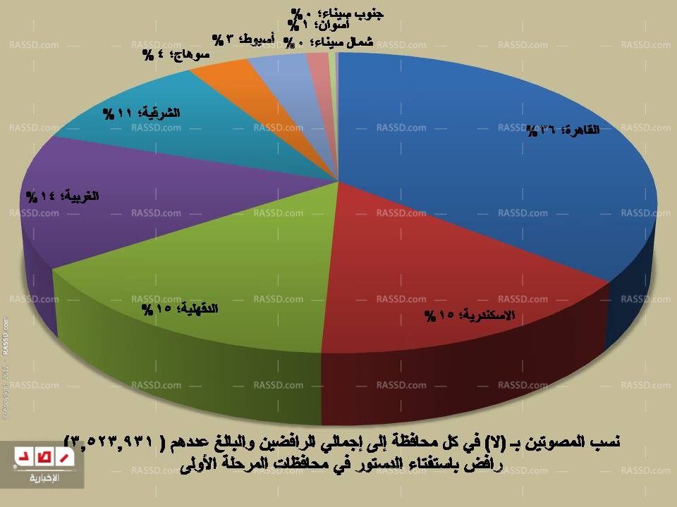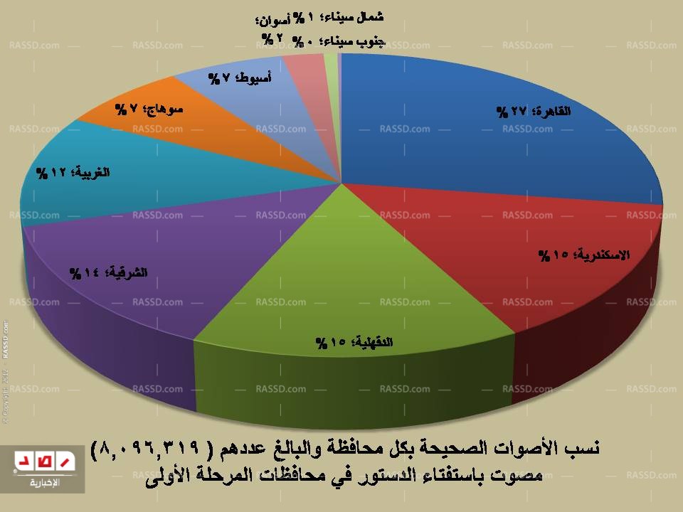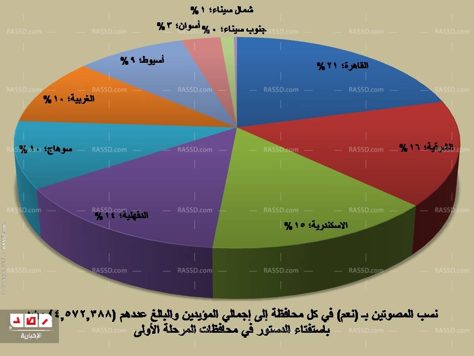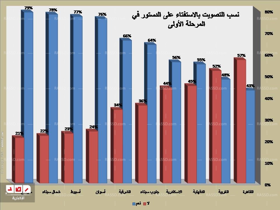 وجاءت نسب التصويت متفاوتة بين محافظات المرحلة الأولى ( القاهرة – الاسكندرية – الدقهلية – سوهاج – الغربية – أسيوط – أسوان – شمال سيناء – جنوب سيناء) وبنسب تأييد أعلى بمحافظات الصعيد ونسب رفض أعلى بالقاهرة والغربية .