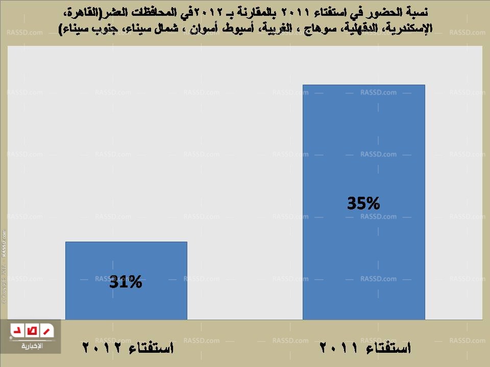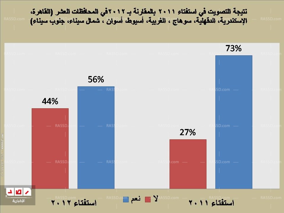 وبالمقارنة بين استفتاء 2011 واستفتاء 2012 فقد جاءت نسب الحضور متقاربة في العشر المحافظات ( القاهرة – الاسكندرية – الدقهلية – سواج – الغربية – أسيوط – أسوان – شمال سيناء – جنوب سيناء ) بنسبة (35%) في استفتاء 2011 بإجمالي (9,002,197) من الحضور ، بينما لم تتعد (31%) في استفتاء 2012 بالمرحلة الأولى 15 ديسمبر ، بإجمالي (8,096,319) من الحضور .