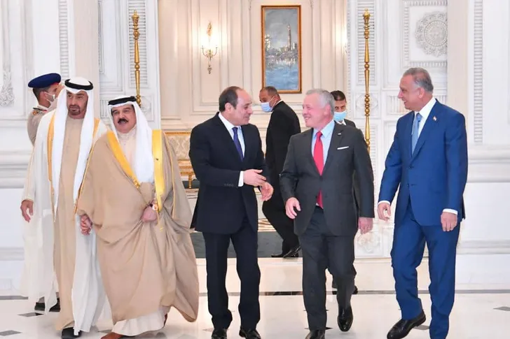 والإثنين، استقبل السيسي، ونظيره الإماراتي الشيخ محمد بن زايد آل نهيان، الذي وصل الأحد، ملكي الأردن والبحرين والكاظمي في مطار مدينة العلمين شمال غربي البلاد.
