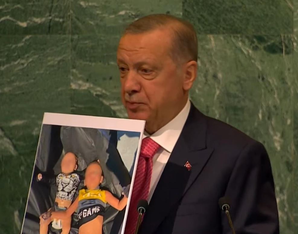 رفع الرئيس التركي رجب طيب أردوغان خلال كلمته بالجمعية العامة للأمم المتحدة صورة طفلين سوريين لقيا مصرعهما غرقا بعد مطاردة السلطات اليونانية لزورقهم قائلا: “السلطات اليونانية أغرقت زوارق المهاجرين في البحر المتوسط، وهو ما يعد جريمة ضد الإنسانية”.