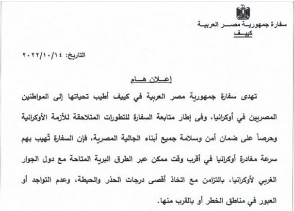 وتابعت السفارة: على من سيقرر الاستمرار في التواجد بأوكرانيا أن يقوم بتحديث بياناته لدى السفارة حتى يتسنى إبلاغه بأية معلومات مستقبلية بشأن التطورات.