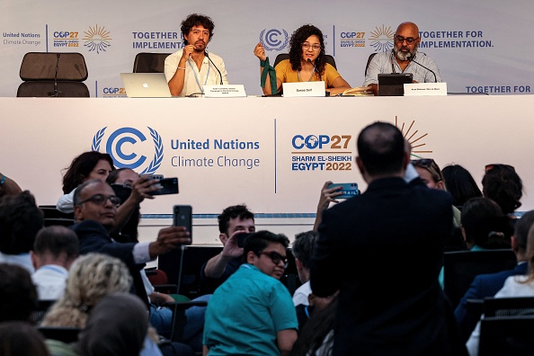 Egyptian member of parliament Amr Darwish interrupts a press conference hosted by the Global Campaign to Demand Climate Justice and attended by Sanaa Seif (C top), sister of imprisoned British-Egyptian activist Alaa Abdel Fattah, on the sidelines of the COP27 climate conference in Egypt's Red Sea resort city of Sharm el-Sheikh on November 7, 2022. (Photo by JOSEPH EID / AFP) (Photo by JOSEPH EID/AFP via Getty Images)