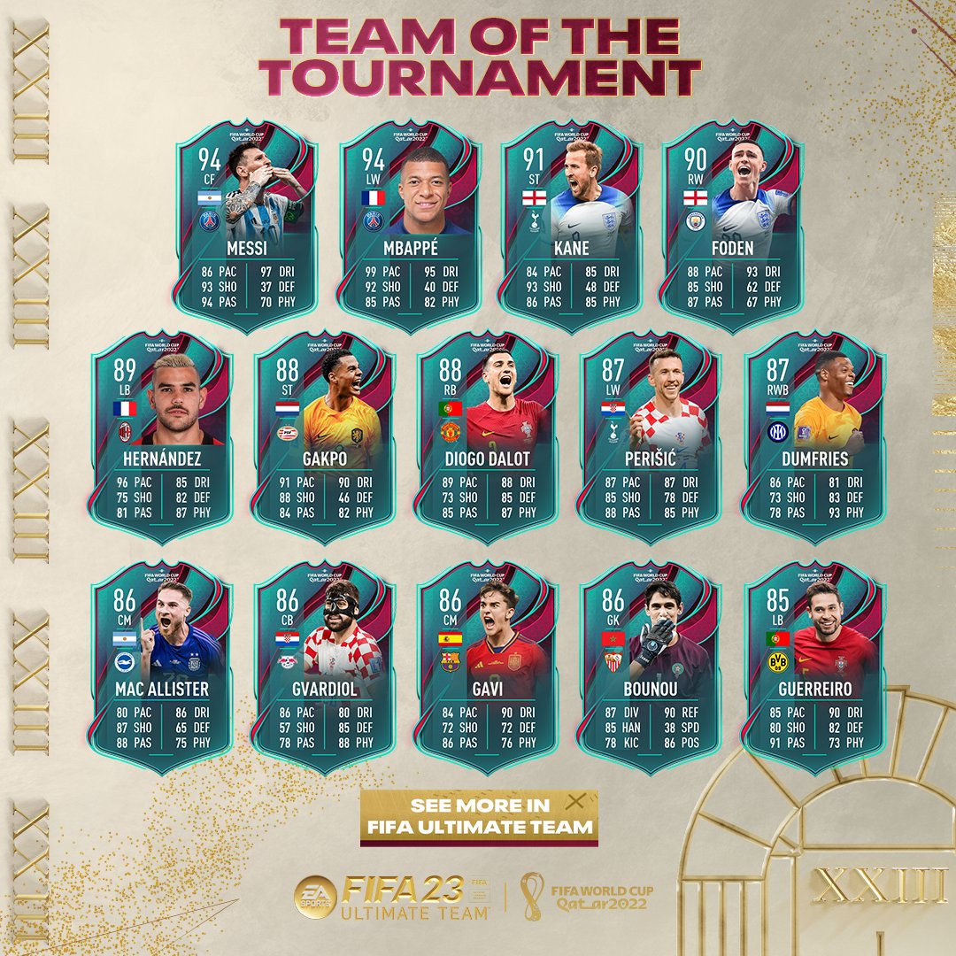 وجاءت التشكيلة على النحو التالي: ليونيل ميسي (الأرجنتين)، كيليان مبابي (فرنسا)، هاري كين (إنكلترا)، فيل فودين (إنكلترا)، ثيو هيرنانديز (فرنسا)، كودي غاكبو (هولندا)، دييغو دالوت (البرتغال)، إيفان بيريسيتش (كرواتيا)، دينزل دومفريس (هولندا)، يوشكو جفارديول (كرواتيا)، ألكسيس ماك أليستر (الأرجنتين)، غافي (إسبانيا)، ياسين بونو (المغرب)، رافاييل غيريرو (البرتغال).