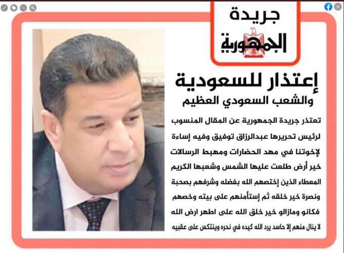 اعتذرت صحيفة “الجمهورية” الحكومية  عن مقال لرئيس تحريرها عبد الرزاق توفيق بعد إساءته لدول الخليج.