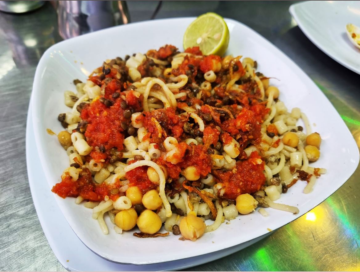 الوصفة بسيطة، وهي أن تأخذ كمية كبيرة من الأرز المسلوق والمكرونة والعدس، ثم تضيف البصل المحمر وكمية كبيرة من صلصة الطماطم بالثوم وقليل من الخل.