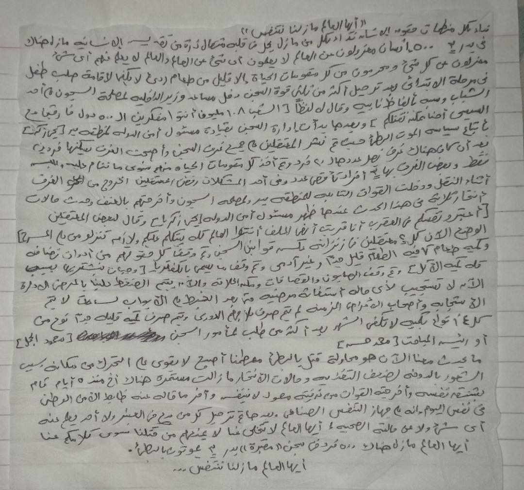 وختمت الرسالة بأن أحد السجناء شنق نفسه في زنزانته، وتم إخراجه منها لا يتنفس، فيما قال لهم أحد الضباط إنه وضع على جهاز التنفس الاصطناعي، لكنهم لا يعلمون شيئا عنه.