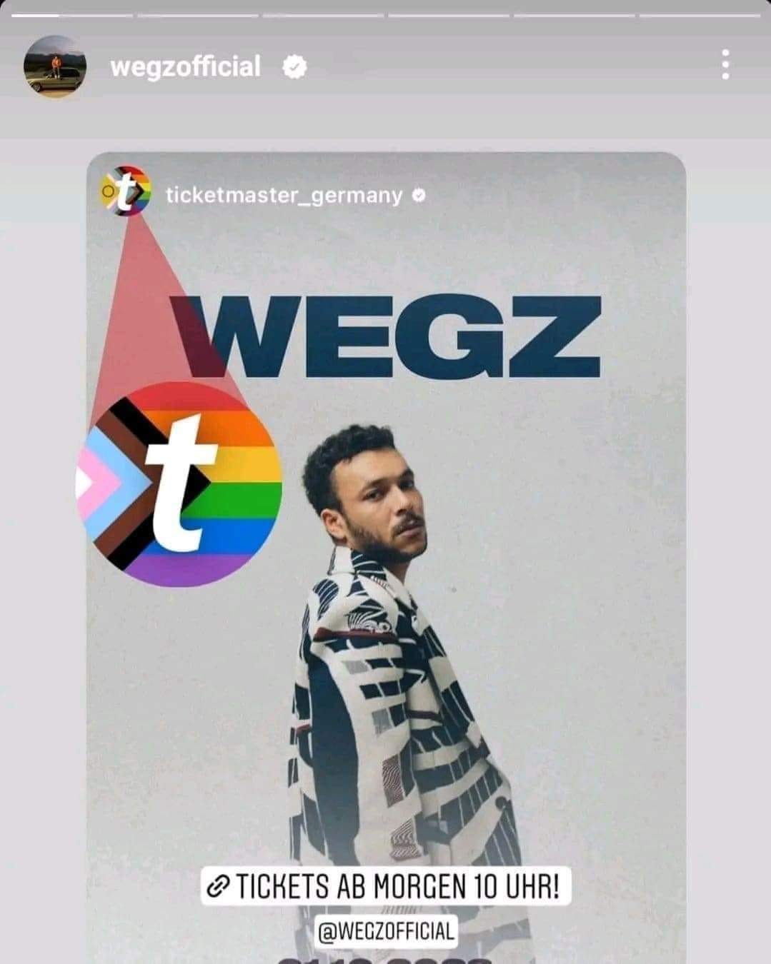 May be an image of 1 person and text that says "wegzofficial ticketmaster_germany WEGZ >t 3 TICKETS AB MORGEN 10 UHR! @WEGZOFFICIAL"