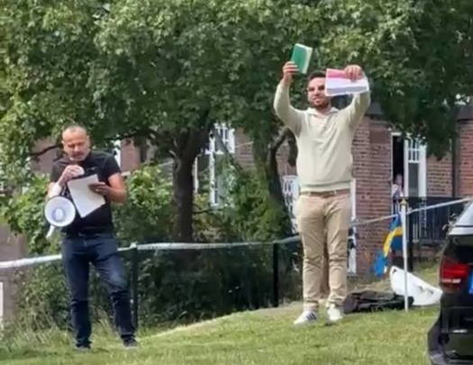 شاهد| تدنيس القرآن والعلم العراقي أمام سفارة بغداد بالسويد