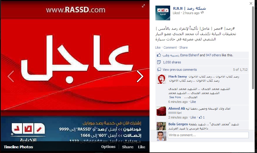 تتعرض شبكة رصد الإخبارية لحملة مناهضة لها علي مواقع التواصل الاجتماعي للتشكيك في مصداقية الشبكة من خلال كتابة تعليقات بألفاظ خارجة عن الذوق العام ، وذلك بعد إنفرادها أمس بنشر خبر يفيد بأن وفاة محمد الجندي حدثت بسبب اصطدامه بسيارة في ميدان عبد المنعم رياض وليس نتيجة لتعذيبه علي أيدي قوات الشرطة كما أشيع خلال الأيام الماضية، ويحاول البعض التشكيك في مصداقية الشبكة ويقومون بحملة مناهضة من خلال كتابة تعليقات بها ألفاظ خارجة عن الذوق العام.