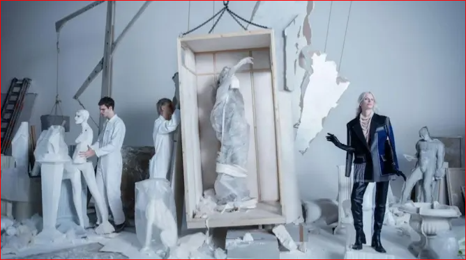 وأظهرت إحدى الصور عارضة أزياء تحمل عارضة أزياء أخرى ملفوفة بالبلاستيك الأبيض، فيما تم تصوير عارضة الأزياء على خلفية من الحجارة المتشققة والتماثيل التالفة ولوح مكسور من الجبس.