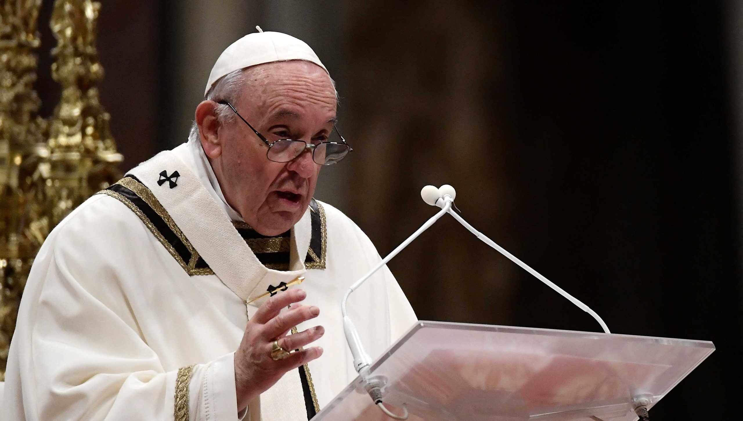 Pope Francis addresses the faithfuls during the Christmas Eve mass at St Peter's Basilica in the Vatican, on December 24, 2021. (Photo by Filippo MONTEFORTE / AFP)